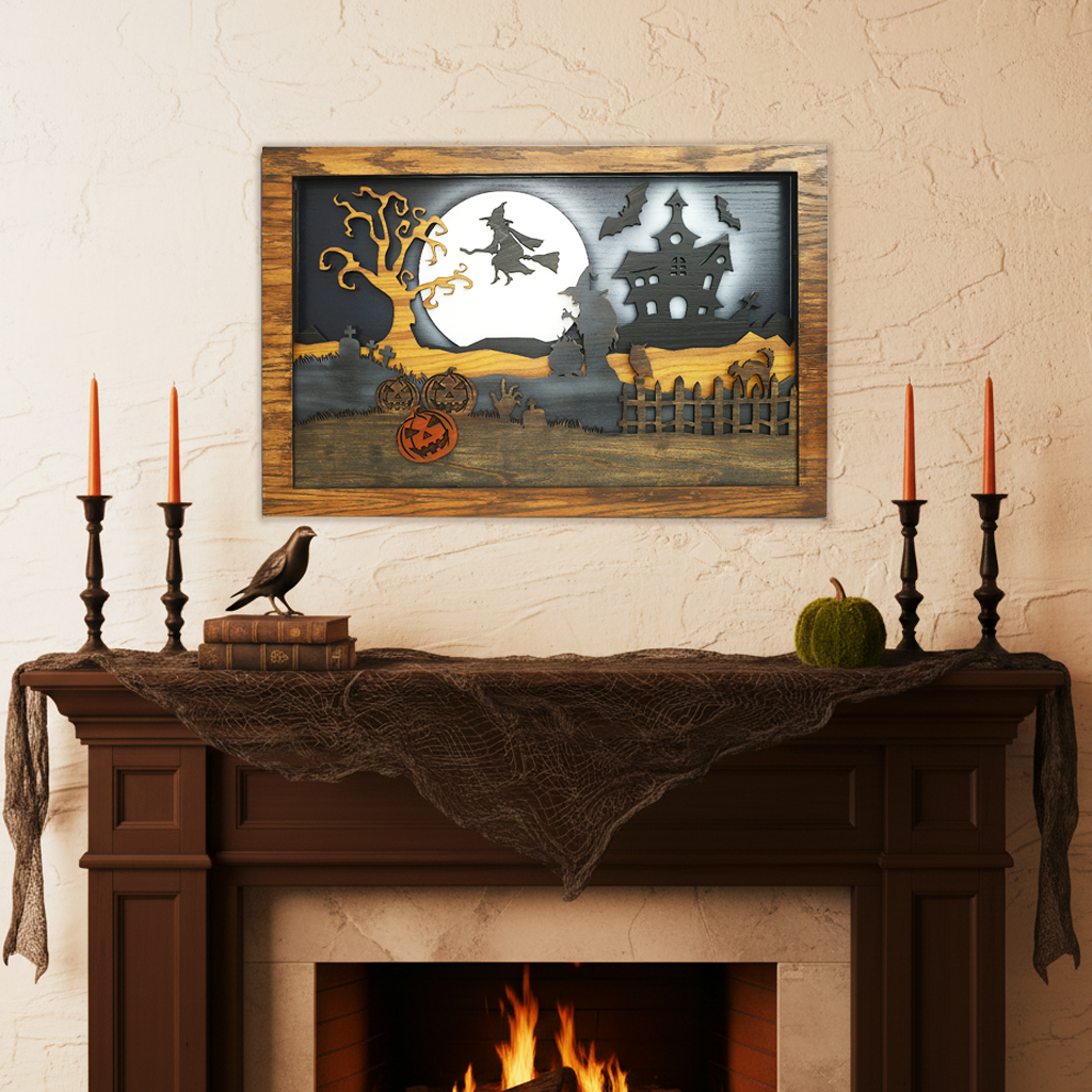 Meticulously handcrafted, the item comprises 7 layers of plywood veneers thoughtfully designed to have a 3D effect when overlapped. Each layer is laser-cut with precision to achieve striking 3D effect. Each layer has been carefully painted it give it a realistic look. Ideal for enhancing interior aesthetics, this piece serves as a sophisticated wooden decorative Halloween Night wall art. It also makes for a thoughtful and elegant gift, suitable for friends and family alike.